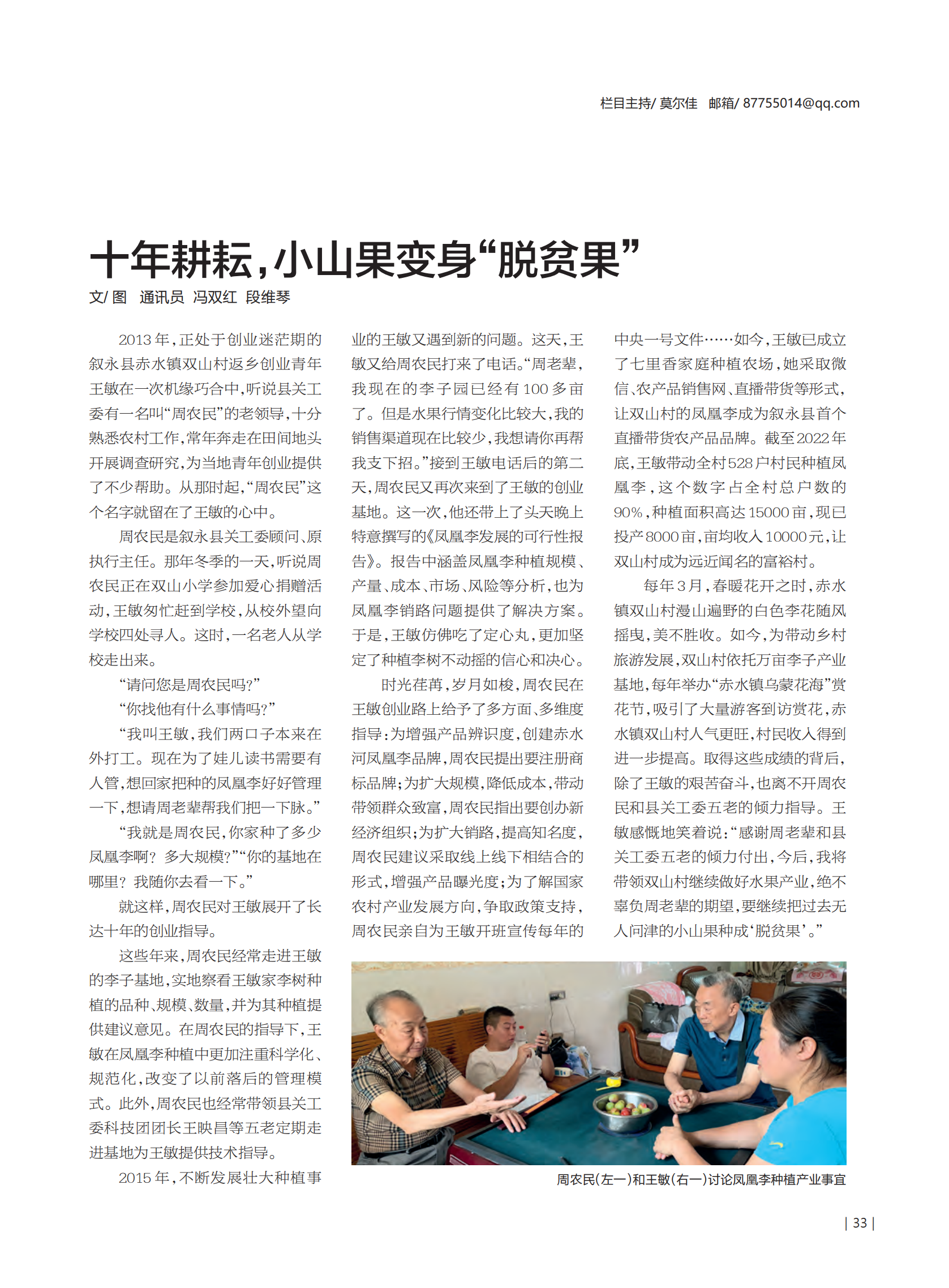 时光荏苒,岁月如梭,周农民在王敏创业路上给予了多方面、多维度指导:为增强产品辨识度,创建赤水河凤凰李品牌,周农民提出要注册商标品牌;为扩大规模,降低成本,带动带领群众致富,周农民指出要创办新经济组织;为扩大销路,提高知名度,周农民建议采取线上线下相结合的形式,增强产品曝光度;为了解国家农村产业发展方向,争取政策支持,周农民亲自为王敏开班宣传每年的中央一号文件……如今,王敏已成立了七里香家庭种植农场,她采取微信、农产品销售网、直播带货等形式,让双山村的凤凰李成为叙永县首个直播带货农产品品牌。截至2022年底,王敏带动全村528户村民种植凤凰李,这个数字占全村总户数的90%,种植面积高达15000亩,现已投产8000亩,亩均收入10000元,让双山村成为了远近闻名的富裕村。