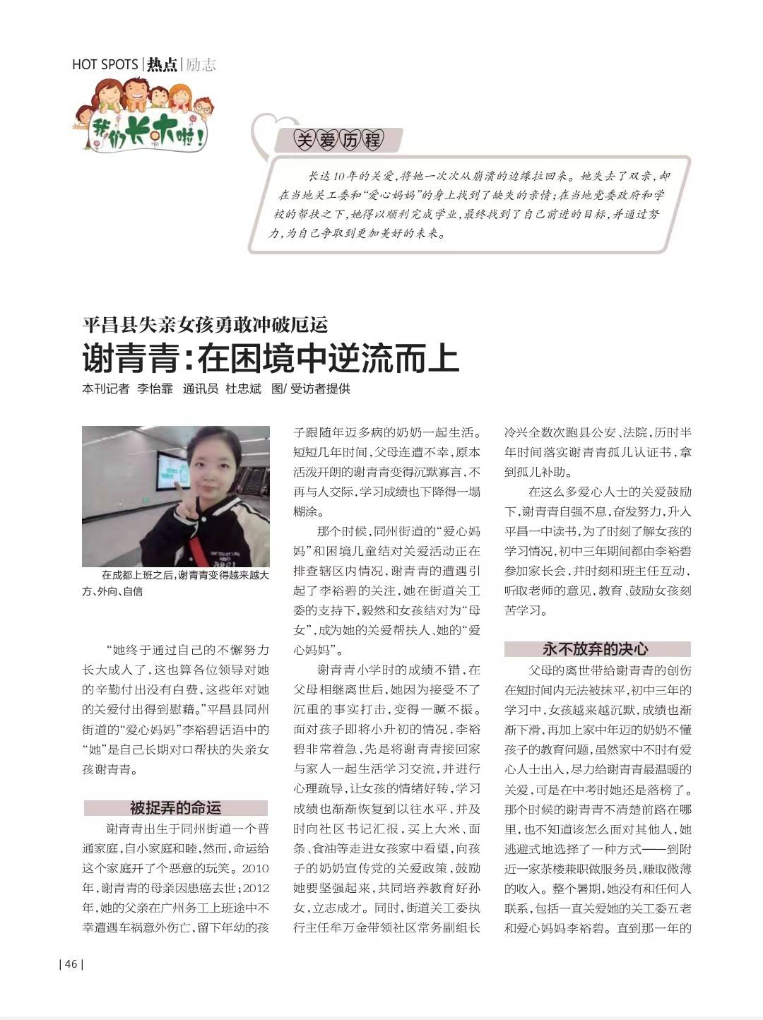 “她终于不负各位领导及所有关爱关心她的人的期望,加之通过自己的不懈努力长大成人了,这也算各位领导对她的辛勤付出没有白费,这些年对她的关爱付出得到慰藉。”平昌县同州街道的“爱心妈妈”李裕碧话语中的“她”是自己长期对口帮扶的失亲女孩,谢青青。