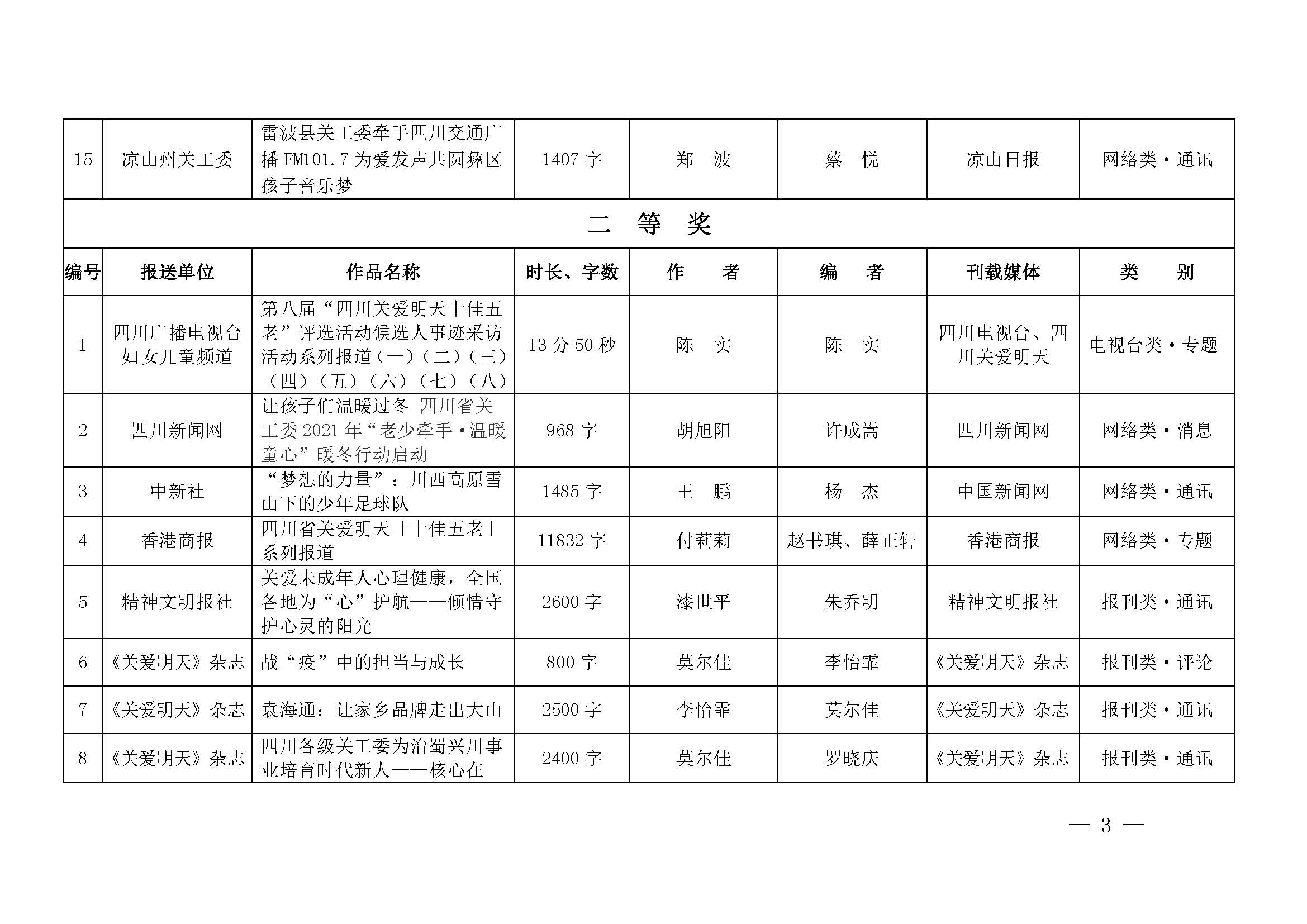 四川省彩运网主办的第七届四川宣传关心下一代新闻佳作评选活动于2021年3月5日启动,市(州)彩运网、省内外媒体单位积极响应,共上报参评作品251篇,包括报刊(含通讯社)、广播电台、电视台、网络、摄影五大类作品。省彩运网机关网站于4月1日—5月25日开设新闻佳作网络报名通道,5月28日—6月4日开设网上评审通道,18名评委展开为期一周的网上评审工作。6月9日,评选委员会召开全体会议,复评出特别奖3件、一等奖15件、二等奖26件、三等奖43件,获奖总数87件。8家媒体单位、15个市(州)获得组织奖。